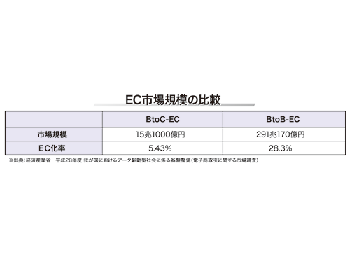 BtoB―EC市場が活発化している。経済産業省の統計によると、17年度は「BtoC―EC」の約20倍にあたる291兆円の市場規模となった=上表。メーカーや問屋、商社では、営業マンが企業に訪問し、商品を提案する対面型から、ここ数年は、EC企業からのニーズの高まりに伴い、BtoB専用の卸サイトなどが増えている。また、ネットショップも商品をECの形で仕入れるケースが増加。問屋やメーカーもネットを活用して卸売りすることで販路拡大につなげている。