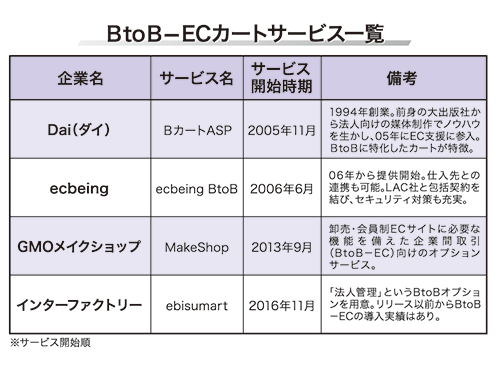 BtoB―EC市場の拡大に伴い、与信管理や代金回収といった支援サービスも充実してきた。05年からBtoB―EC専用カート「BカートASP」を提供するDai(本社京都府)はすでに数百社で導入されている。Daiは94年の創業以来、BtoBに関する情報誌の出版物を発行。出版事業で蓄えたノウハウや情報を活かしたフランチャイズメディアの運営と「BカートASP」を展開する。