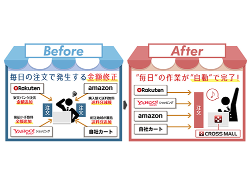 「クロスモール」は楽天やヤフー、アマゾンなど複数店舗の運営業務を一元管理できる。16年12月に受注処理の自動化機能をリリースした。