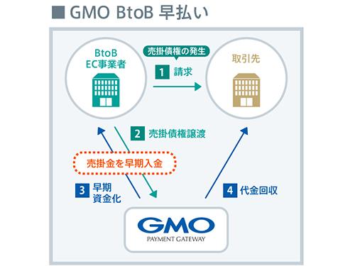 「GMO BtoB早払い」は、法人向けEC事業者が保有する売掛債権を同社が買い取ることで、入金期日よりも早期に売掛金を資金化できるファクタリングサービス。最短3~5営業日で入金するという。