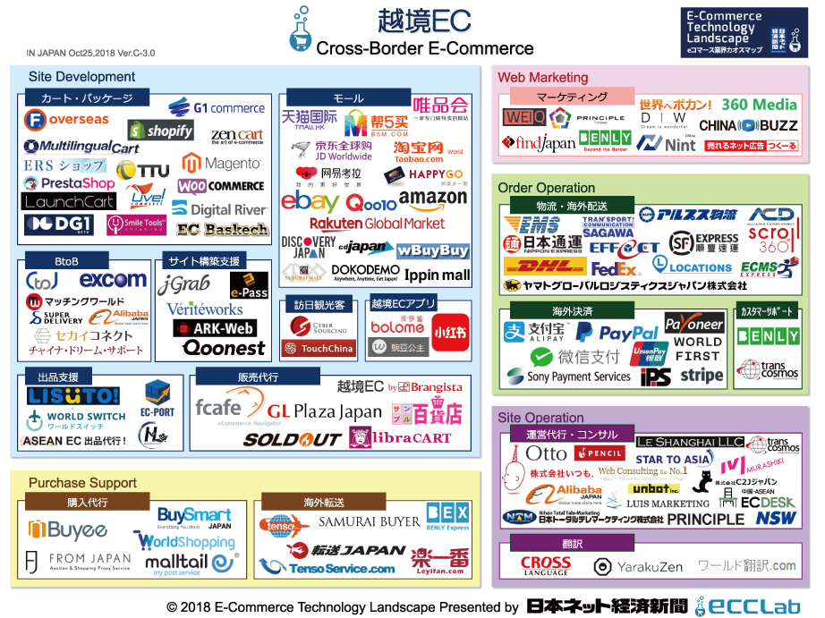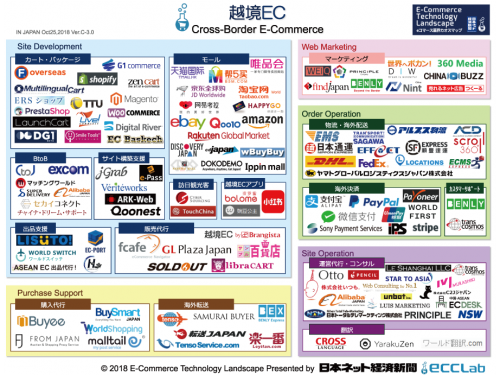 中国の関税の変更や国際スピード郵便(EMS)の値上げなどで、落ち着いた感のある越境EC市場だが、最近再び市場拡大の兆しがあるという。中国以外の台湾などへの越境EC市場が拡大したり、現地モールに頼らない越境ECの手法が広まりつつあることが背景にある。インバウンドと連動した越境EC施策も増えている。第2次越境ECブームが来る可能性は小さくない。越境ECや海外進出に必要なサービスを、「日本ネット経済新聞」とEC業界のウェブメディア「eコマースコンバージョンラボ(eccLab)」が共同でマップにまとめている。