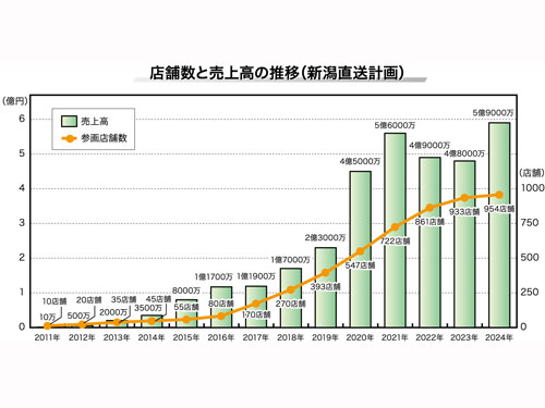 生産者からの資料請求や、地方の金融機関や既存出店者からの紹介をいただくことも多くなりました。産直サイトも増え、ふるさと納税もあり、当社がまだアプローチしていないところにお声がけをさせていただいています。こうして24年は954店舗、取扱品目は2187商品に拡大しました。新潟県内で認知度が高まり出店者は増えていますが、まだまだモノづくりをしている生産者はたくさんいると思います。