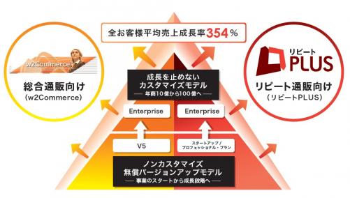 成功企業の最新のノウハウが凝縮されたオールインワンのECサービス「w2Commerce V5(以下V5)」を導入することにより、飛躍的な成長を遂げることができます。お客さまが独自戦略を実現し、さらなる成長を遂げるため、スピーディーにカスタマイズできる「w2Commerce エンタープライズ版(以下エンタープライズ版)」へ容易に切り替えることも可能です。当社は、お客さまの成長を止めません。実際に「V5」を導入されたお客さまの約1割が「エンタープライズ版」に切り替えており、その後、10倍近い成長を実現しています。(左図参照)