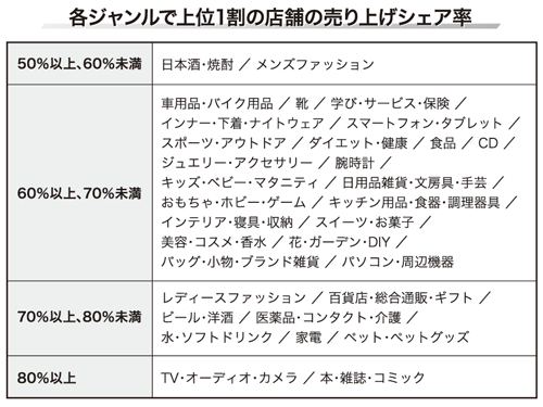 楽天市場に出店する際は34ジャンルから自店の属するジャンルを選ぶようになっているが、サヴァリでは店舗数、レビュー、アイテム数に関しては独自の基準を設け、ウエートの大きい13ジャンルにまとめている。また、調査では楽天ブックスと電子書籍のkobo(コボ)に関するデータを除いている。