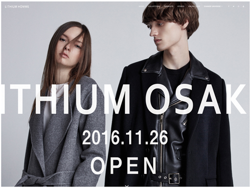 「LITHIUM HOMME」をクリックするとブランドページが見られ、ニュースやコレクション、プロダクト、ショップ紹介などが分かりやすく表示されている。