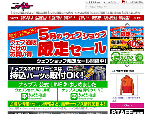 ECサイト「ナップスウェブショップ」=写真=は、ヘルメットやグローブ、ウエアのほか、バイク部品などを販売している。神奈川や東京を中心に20店舗を展開しており、多くの商品点数を取りそろえている。