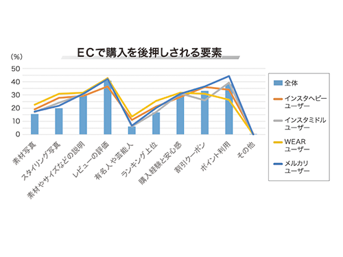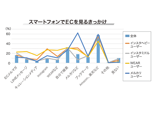 コンサルティングのシンクエージェント(本社東京都、樋口進社長)は6月6日、「オムニチャネル&デバイス使い分け実態調査」の結果を発表した。「スマートフォンでECを見るきっかけ」や、「ECで購入を後押しされる要素」を聞いたところ、インスタグラム、WEAR、メルカリのユーザーで回答に差が見られた。