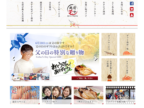 たからや商店(本社福井県、宝山明伸社長)は、カニや干物のECサイト「越前宝や」を運営している=写真。楽天市場などのECモールで、ライバル店舗の多くない干物ギフトの商品をメインに販売している。最も人気のある「のどぐろ入り高級干物6種18尾セット」(税別3660円)は、16年6月から17年5月までの1年間で、5000セット以上を販売したという。