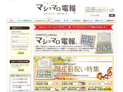 グーグルにて「食べられる電報」と検索すると、マシュマロやマカロンでメッセージを伝える「マシュマロ電報」や「マカロン電報」が上位表示されます。今回はアイオンラインが運営するECサイト「祝電、メッセージギフトのマシュマロ電報」を取り上げます。