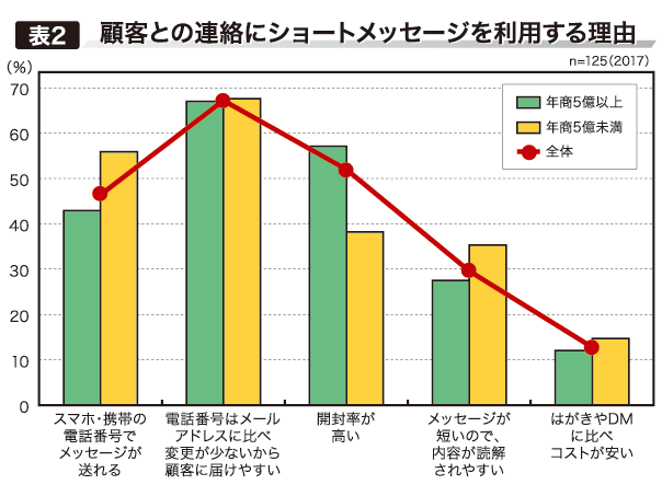 「SMS」を連絡方法に利用している通販事業者の約67%は、「電話番号はメールアドレスに比べて変更が少ないから顧客に届けやすい」と考えている(表2参照)。