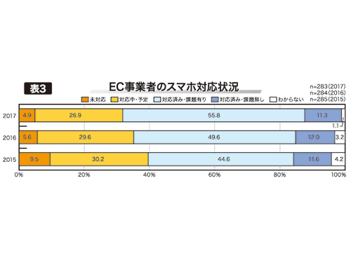 通販事業者のスマホ対応状況を調査したところ、67.1%が「対応済み」と回答した(表3参照)。前年の調査結果よりも5.5ポイント増加している。
