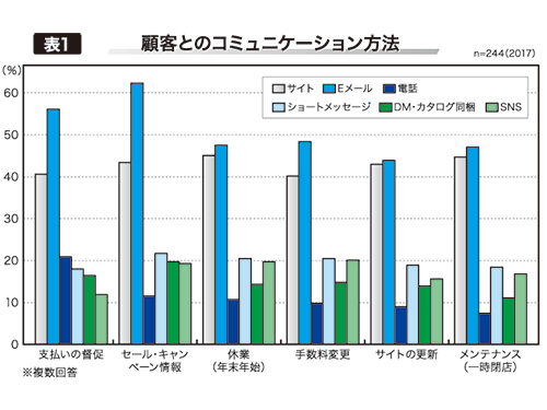 今回の調査で「顧客とのコミュニケーション方法」について調べた(表1参照)。調査したすべてのシーンでメールでの連絡が最も多く、ついでサイトでの通知が多かった。多くのシーンで3番目に多く利用されていたのは、スマホや携帯電話向けの「ショートメッセージ(SMS)」だった。