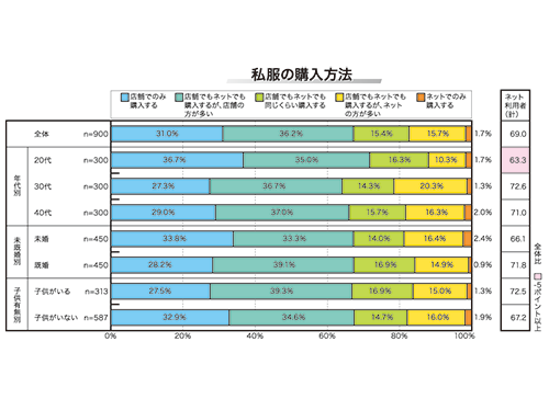 年代別では、「店舗でのみ購入する」が20代で36.7%と最も高い。私服購入でのネット利用者は30代や40代で多かった。また、子どもの有無では、子どもがいる女性のネット利用率が72.5%で、子どもがいない女性は67.2%となった。