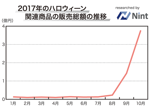 「Nint」の調査では、ハロウィーン関連商品は早期割引などが実施される8月ごろから販売数が増加し、10月にピークを迎える。8~10月の3カ月間で年間販売額の8割ほどが計上されているようだ。