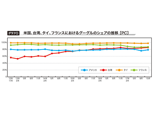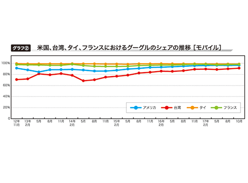 アジア9拠点でコンサルティングを展開するアウンコンサルティング(本社東京都、信太明社長)は11月30日、世界40カ国を対象に行ったパソコンとモバイルにおける主要検索エンジンシェアの調査「世界40カ国、主要エンジンシェア【PC・モバイル】」を発表した。それによると、多くの国と地域でグーグルがトップシェアとなり、特にモバイルでは40カ国中37カ国でグーグルのシェア率が90%を超えていることが分かった。