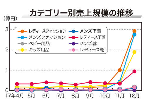 全体的に11月から売り上げが伸び始め、12月に販売のピークが訪れる。最も売り上げ規模が大きいレディースファッションでは、11月には全体で1億円近い規模が売れ、12月には約3億円の売り上げ規模に達している。