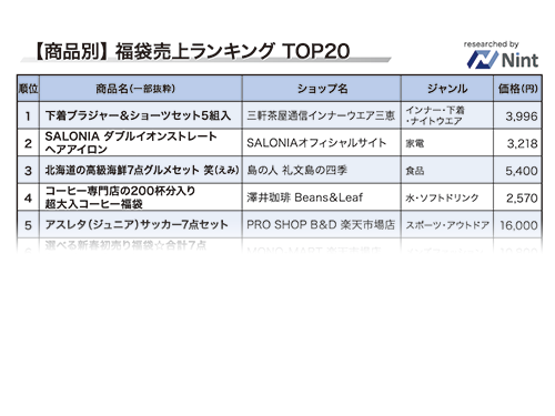 「Nint」はこのほど、楽天市場内において「福袋」カテゴリーの商品や、商品名に「福袋」と入った商品の売り上げを、推計値をもとにランキングとして発表した。