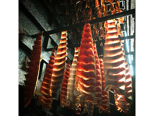 「戦時中、先代の南保留太郎が北方の先住民から製法を学びました。その製法を現社長の南保敬二がより詳しく調べ、新巻鮭燻製やインディアンスモークなど当時作られていたであろう燻製を開発しました。燻製法には主に冷燻・温燻・熱燻がありますが、当店では素材が一番おいしくなる方法を選んで製造しています。商品開発で一番苦労したのは『甘エビの燻製』で、燻製のかかり具合など試行錯誤を繰り返し、約10年かけて完成。味は良いが見た目がうまくいかず、近所や知り合いに何度も配って回ったと聞いています。甘エビの燻製は人気が高く、『食べ始めたら止まらない』という声を多くいただいています」