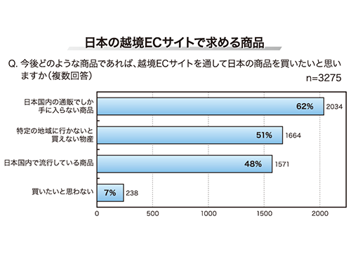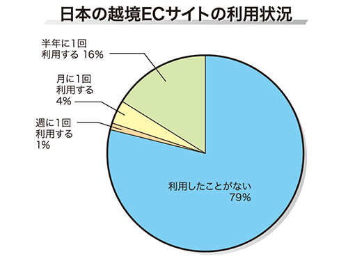 日本製品を販売する越境ECサイトの利用経験については、79%が「利用したことがない」と回答。理由としては「日本で直接買うから」が56%、「日本旅行中の知人に頼むから」が13%と、地理的な近さに起因する理由が多かった。