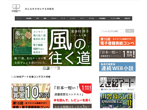 「22世紀アート」は、電子書籍専門の出版社。通常、読者が出版社のサイトを訪れることは珍しいと思いますが、このサイトでは、著書と著者の情報を配信するだけではなく、出版された電子書籍の読者や、より書籍を魅力的にするための表紙をデザインしてくれるデザイナーも巻き込んで、何度も訪れたくなるコンテンツを提供されております。