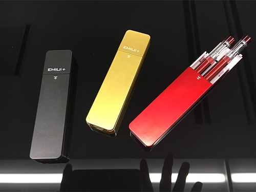 同社が販売するオリジナル電子タバコ「エミリミニ+(プラス)」は、独自の設計で高級感を演出している。従来品ではプラスチックを使っていたリキッドカートリッジにガラスを採用。電源ボタンがなく吸引するだけで香りが発生する仕組みにもしている。