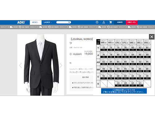 スーツのAOKIは、顧客が「試着できない」という自社ECサイトの弱点を、バナーを表示するウェブ接客ツールの導入により補おうとしている。