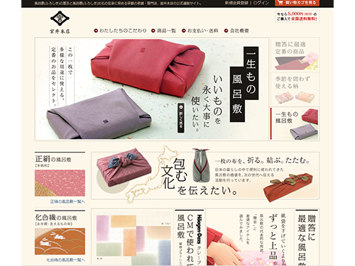 「贈答に最適な風呂敷」「季節を問わず使える風呂敷」「一生もの風呂敷」「包む文化を伝えたい」「一枚の布を、折る。結ぶ。たたむ。」「紙袋を下げていくよりもずっと上品。」「CMで使われている風呂敷」など、商品画像に添えられているキャッチコピーからは、老舗の自信がうかがえます。