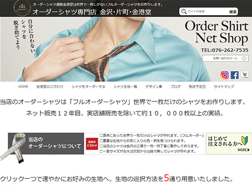 金港堂は08年、ECサイトを開設した。新規顧客の獲得促進のため、17年にECサイトを刷新。初めて来訪したユーザーが「フルオーダーシャツ」を注文したいと思ってもらえるように、大胆なバナーをトップページに配置するとともに、手軽に注文を完了できることを伝えている。