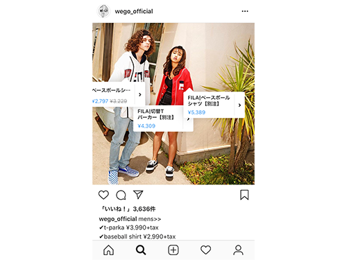 カジュアルウエア販売のウィゴー(本社東京都、高橋英朗社長)は6月、画像SNS「インスタグラム(インスタ)」のショッピング機能の利用を開始した。投稿画像からECサイトにユーザーを効果的に誘導できる機能を活用することで、売り上げ拡大につなげている。