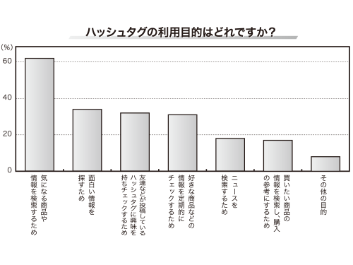 ハッシュタグを利用したことがあるユーザーに対し、ハッシュタグを利用する目的を選択式で質問したところ、62%が「気になる商品や情報を検索するため」と回答。ハッシュタグが商品の情報収集にも活用されている実態が示された。