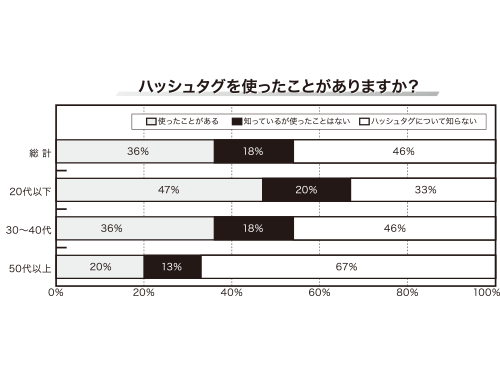 アライドアーキテクツは約4500人の女性SNSユーザーに対し、ハッシュタグの利用実態を調査した。その結果、全体の36%がハッシュタグを「使ったことがある」と回答。「知っているが使ったことはない」(18%)を加えると認識率は半数を超えた。