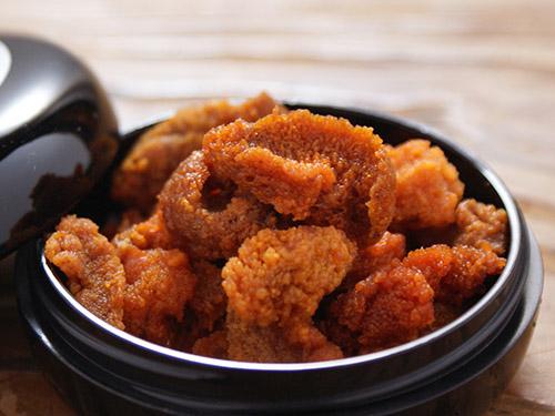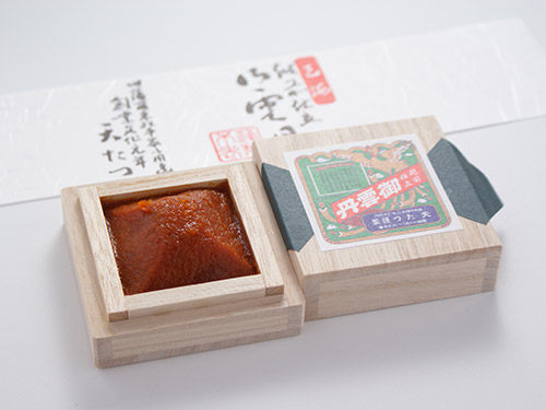 「天たつの3代目当主・天野五兵衛が、日持ちのする保存用のウニとして『塩蔵法』による『越前仕立て汐うに』を考案し、現在も同じ製法で作っています。余分なものは一切加えず、100gの製品を仕上げるのに100個以上のバフンウニの卵巣を使用しており、ねっとりと濃厚で峻烈(しゅんれつ)な味わいです。長い歴史を持つこの商品の背景やストーリーを、パッケージやサービスなどで表現できるよう、試行錯誤を重ねています」