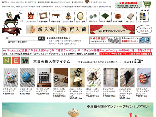 アンティーク・インテリア雑貨を販売するECサイト『malto(マルト)』(写真)を運営するエスエーエルハウス(本社東京都、前川祥子社長)は、高円寺にある築80年の古民家に実店舗も構えている。童話の世界に迷い込んだような店内には、かわいらしくキッチュなアイテムが並ぶ。前川社長が海外に行って買い付けたアンティークも多い。その雰囲気をサイトでも表現するため、商品撮影やサイトデザインなどは、前川社長自らが手掛け、自社サイトのみで展開している。