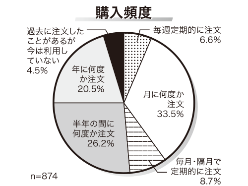 購入頻度では、「月に何度か注文」という回答が全体の33・5%を占めた。平均の月間購入金額では、「3000~5000円未満」という回答が同28・6%と最も多かった。