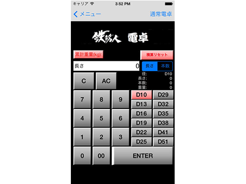 スマートフォンアプリ「鉄筋人」は無料で配信。特別機能として、鉄筋用の重量計算機を追加している。作業に必要な機能を備え、「ダウンロード数でいえば、国内の鉄筋加工従事者の約10分の1が利用している」(伊地知社長)と話す。