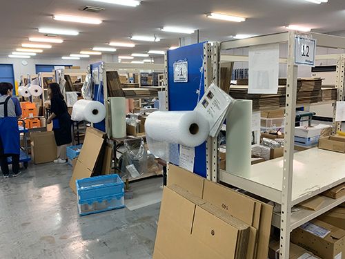 3階には、同社が長年の作業の中で培ってきた物流のノウハウがつまっている。梱包機器は2台設置。機器を中心に、棚を6カ所に設けており、