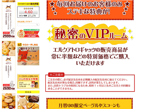 同社では、定期購入会員向けの「秘密のVIPルーム」ページを用意している。同ページには、定期購入会員しか買えないベーグルをラインアップ。全てのベーグルを、事業者向けに設定している卸価格で販売をしている。同ページは非会員でも見られるようになっており、定期購入会員への引き上げを図る意味でも有効に機能しているようだ。