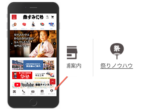 スマホファーストを目的として19年12月19日にリニューアルしたばかりという、祭り用品専門店「祭すみたや」のECサイト。まず注目したいのが、スマホサイトの「固定フッタ最右」というゴールデンポジションを獲得している「祭りノウハウ」というコンテンツです。