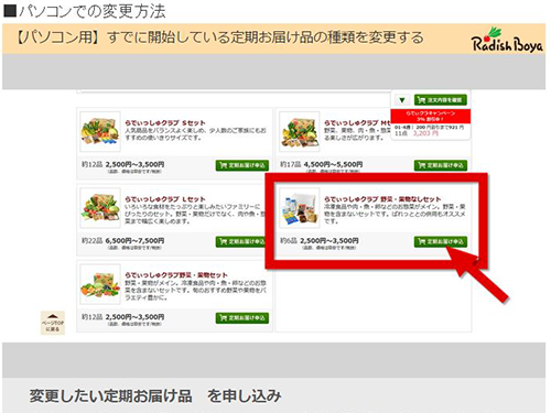 同社は「定期お届け商品」の種類を変更する方法をスライドショーで紹介している。ページのどの部分をクリックし、どのように手続きを進めれば変更を完了できるか、17枚のスライドにまとめて、一手順ずつ分かりやすく紹介している。