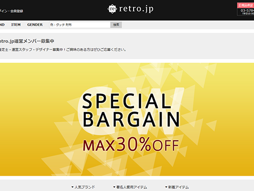 運営しているECサイトの名称は「retro.jp(レトロドットジェイピー)」=写真。掲載商品数は約5000品目で、20以上の特集ページがあるのが特徴。エルメスやグッチなどブランド別に紹介するほか、「セレブが愛用するブランド品」といったテーマごとに商品を掲載している。