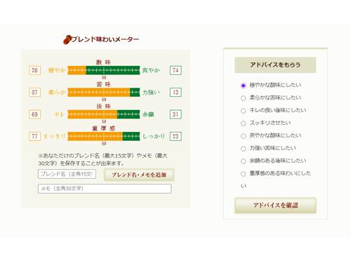 コロンビア珈琲(本社兵庫県、岡崎広政社長)が運営するECサイト「極上珈琲 生豆本舗」では、ECサイト上で、自分だけのオリジナルブレンドを作れるサービスを提供している。オリジナルブレンドの作成には、同サイトの「ブレンドシミュレーター」を使う。最大5種類のコーヒー豆と、各豆の割合を入力することで、自分だけのオリジナルブレンドを作成できる仕組みとなっている。