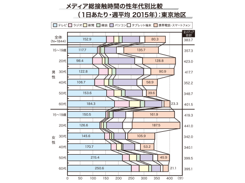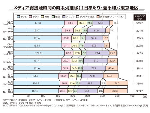 東京地区では06年から、いわゆる4マス(テレビ・ラジオ・新聞・雑誌)への接触時間は減少傾向にあるのに対して、「携帯・スマホ」の接触時間は伸び続けている。15年調査では「携帯・スマホ」の接触時間(1日あたり・週平均)は80・3分で、メディア接触時間全体における比率は20・9%に達した。