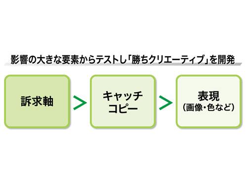 このように、まずは分かりやすい大きな訴求軸をテストしていくことから始めて、どちらの訴求軸の反応が良かったかを検証し、効果の良かったものを採用していきます。