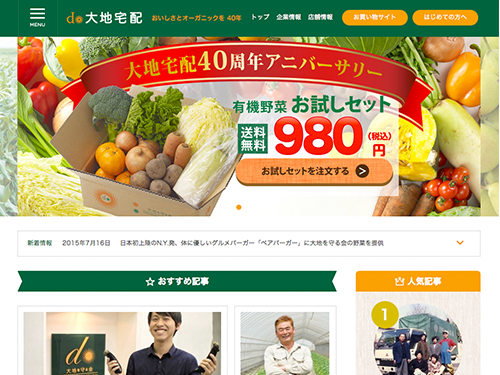 ネットと宅配の融合にも着手した。これまで同社では、入会金や年会費が必要のないネット通販(ウェブストア)と、首都圏限定で週に一度決まった日時に届ける会員制宅配サービスの2種類を展開してきた。6月から、サービスを「大地宅配」として一本化。ECで購入した自社便エリアの会員に、電話などによるアプローチをすることで、宅配への誘導を促している。