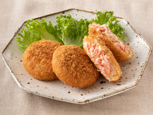 「震災で当社の工場隣の倉庫が全壊しました。そこを改装し、2011年12月に直売所をオープン。もともと製造していたカニの加工品に加え手作り総菜などを販売し、地元の方と関わりが持てる店を作りました。これをきっかけに自社商品の開発に力を入れ、最初に誕生したのが『ずわいがにたっぷりコロッケ』です。ジャガイモがベースでカニが真ん中に入っており、シンプルな味付けでカニ本来の味を楽しめる、カジマらしい商品です」