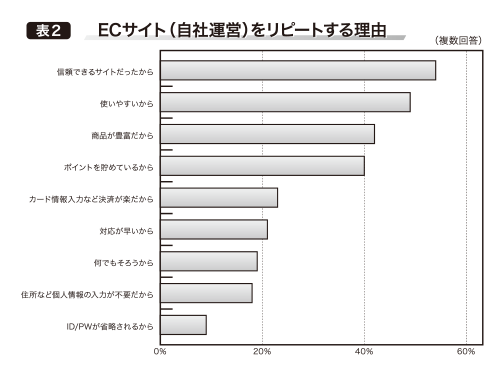 一度利用した自社ECサイトをリピートするユーザーは96%に上った。リピートする理由の1位は、「信頼できるサイトだから」(54%)。「使いやすい」「ポイントを貯めている」「対応が早い」などの理由を抑えている(=表2)。