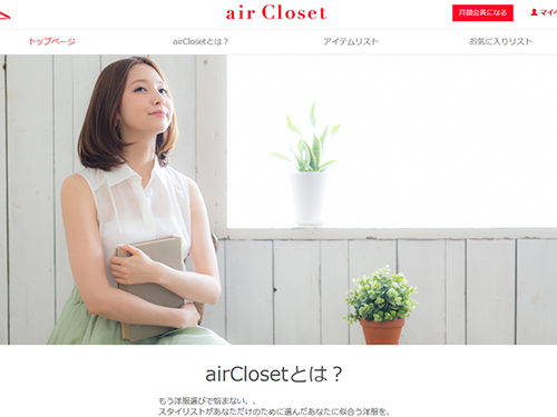 サイト名は「air Closet(エアークローゼット)」=写真。会員登録の際に好みの色や服の属性などを入力してもらい、登録した情報をもとにスタイリストが顧客に合う服を選んで発送する。