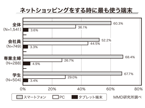そのうち、6カ月以内にネットショッピングを利用した人は、7割強の1541人だった。利用する端末を聞いたところ「スマートフォン」の回答が60・3%となった。属性別では会社員は52・2%、専業主婦は68・4%、学生が67・7%だった(図表)。