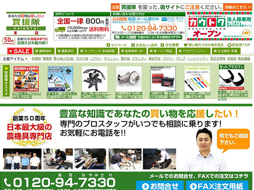 農業機械などの製造販売事業者、平城商事(本社福岡県、平城賢三社長)は、JAなどを主な取引先とするBtoB販売に加え、05年に一般消費者向けのネット通販サイト「買援隊」を開設した。