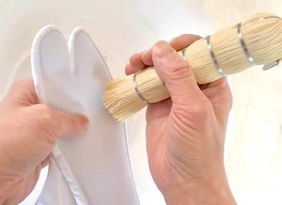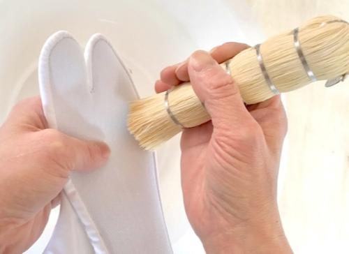「足袋のお見立てイベントで各地に行った際、足に問題を抱えている方が多いと気付きました。昔から当社の足袋を履くと膝や股関節の痛み、外反母趾などが改善したと言われることが多く、毎日履ける新しい足袋を作ろうと考え、土踏まず丈の『こたび』を開発しました。『こたび』は、移動中やスポーツ前後など、さまざまな場面で足を健康な状態に戻すサポーターとして使えます。『足袋ブラシ』は、世の中に足袋底などをきれいに洗えるブラシがなかったので、さまざまな素材を探してサボテンの繊維に出会い、オリジナルブラシを作りました」